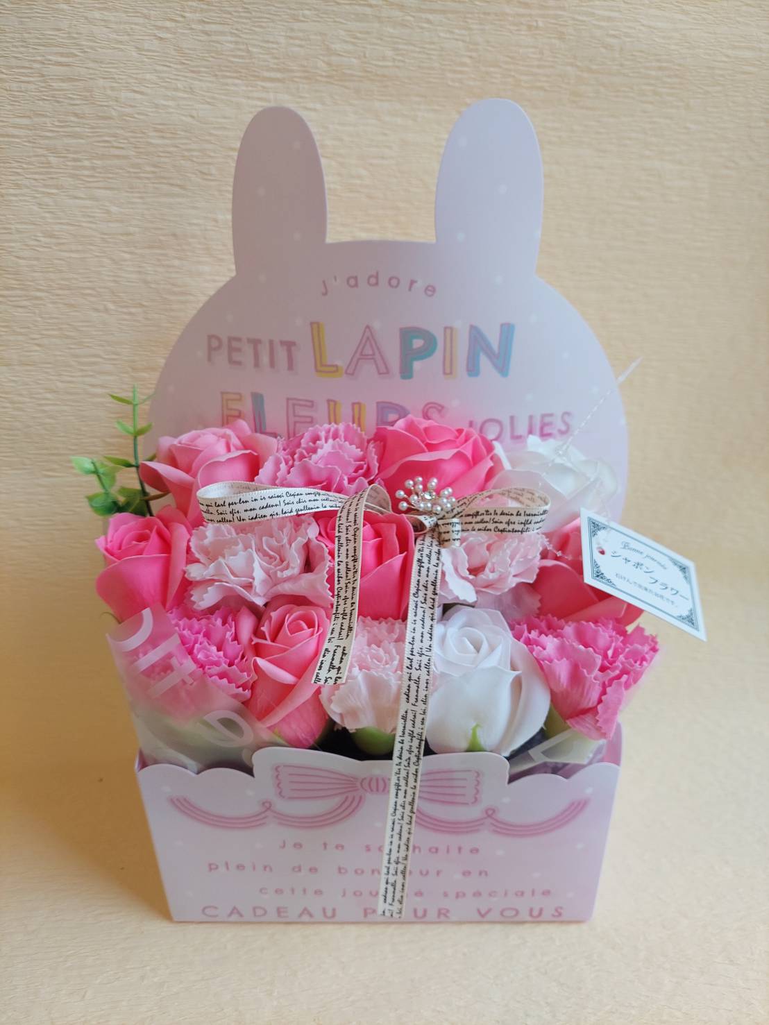 シャボンフラワー ボックスにぎゅっとピンクのお花とくまちゃんが詰まったアレンジメント