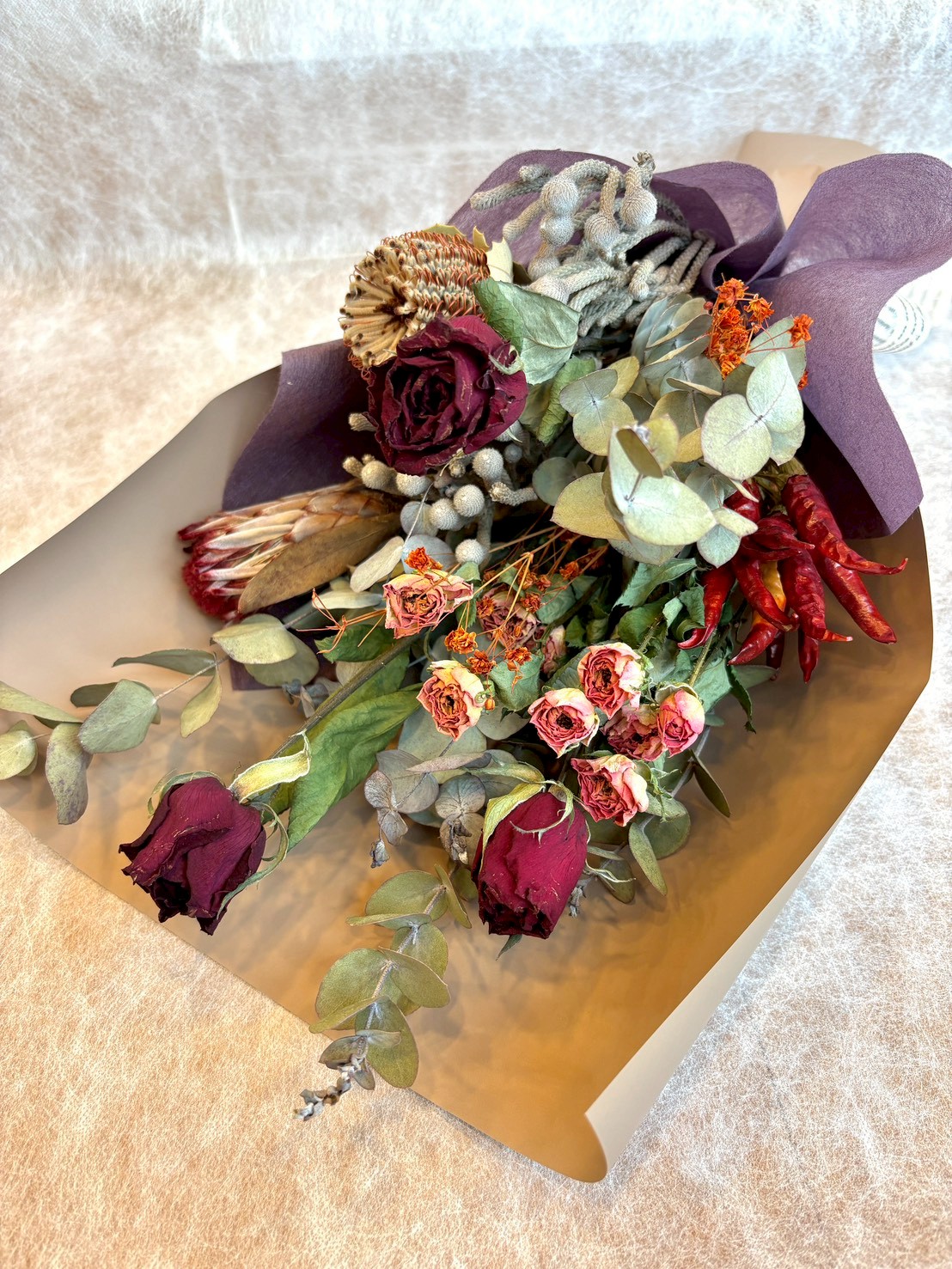 ・ドライフラワーは大変壊れやすいので、梱包には最善の注意を払っておりますが、配送中にわずかながら花びらが散ってしまう可能性がございます。ご了承くださいませ。