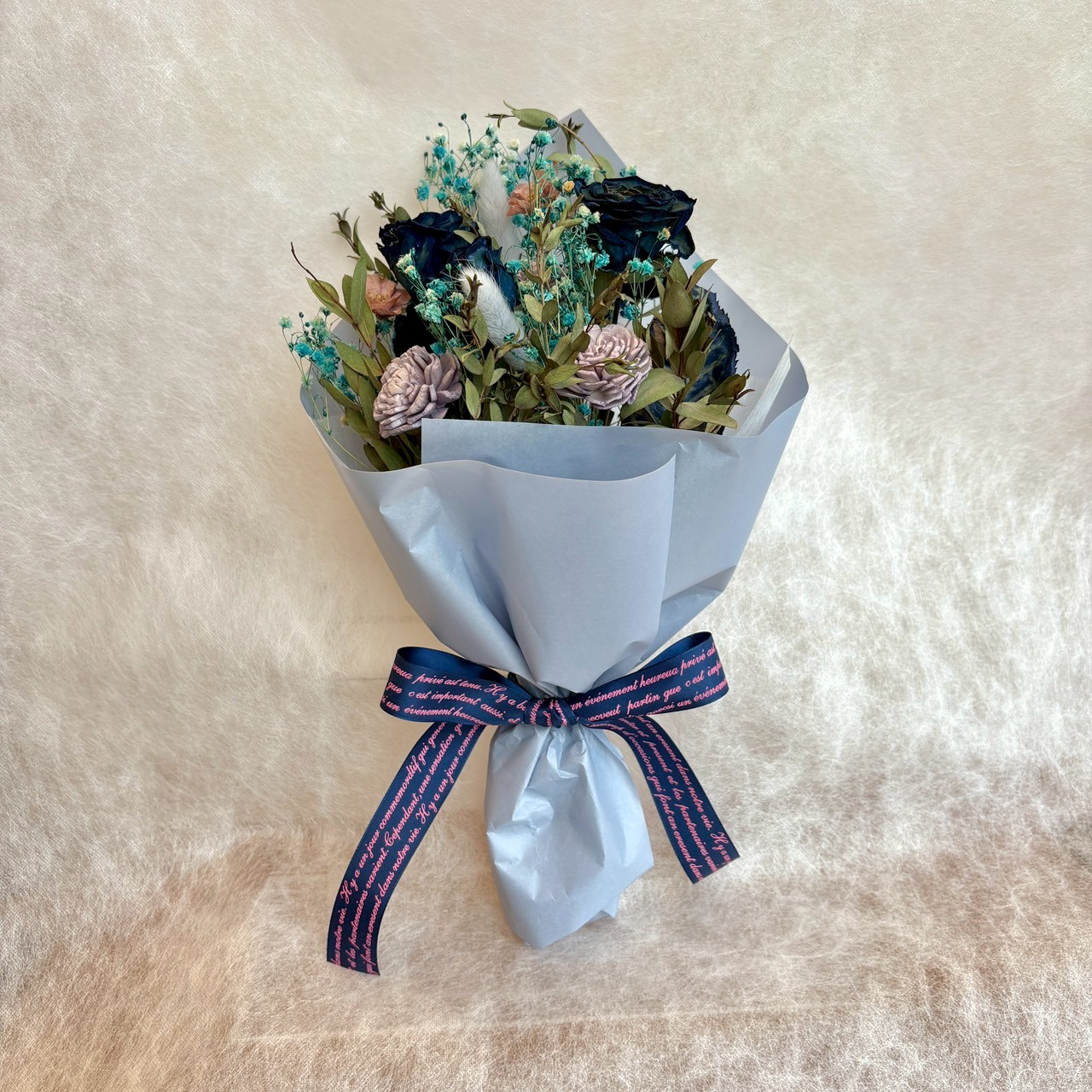 ブルーベースの可愛らしいドライブーケです。