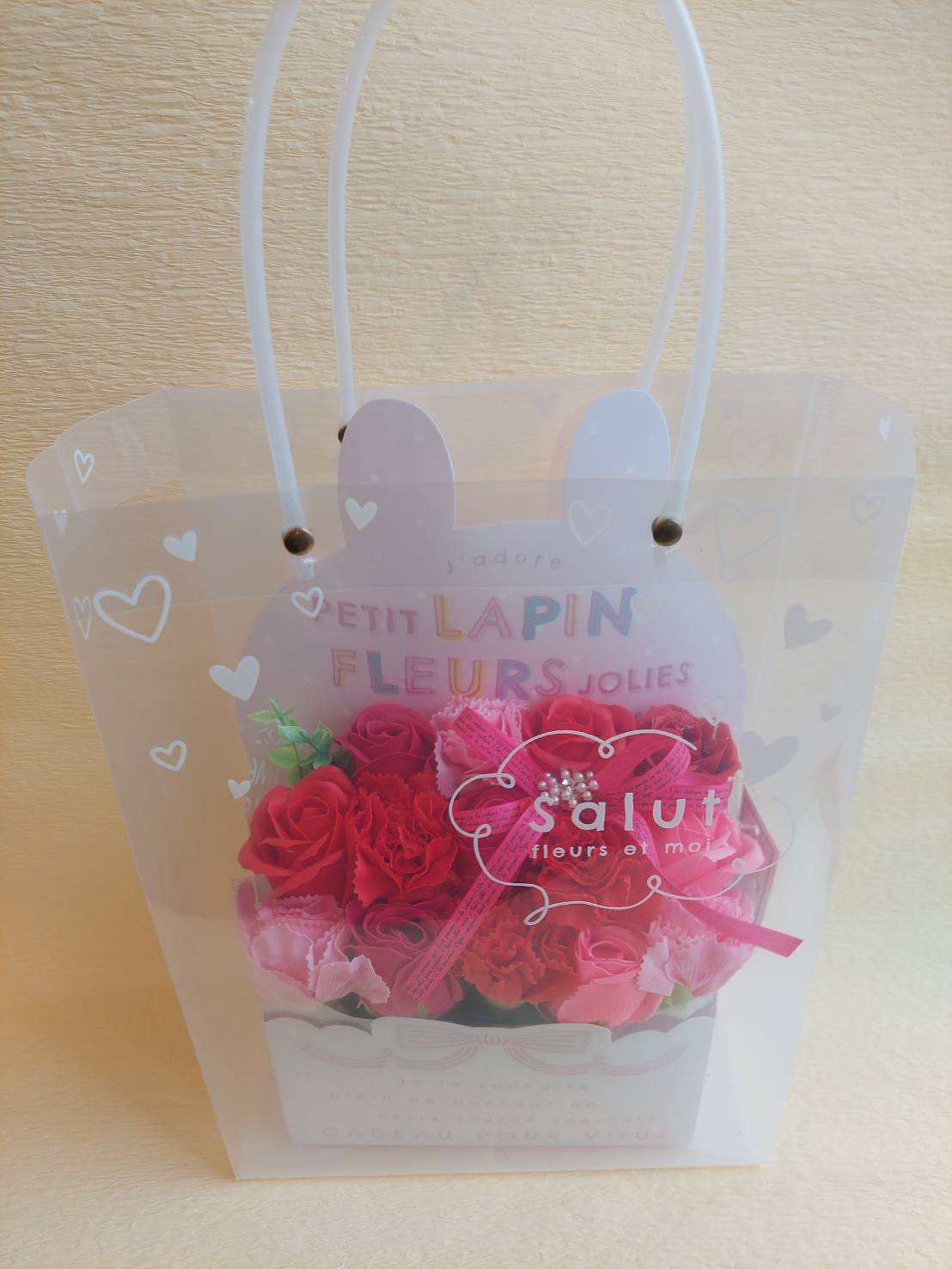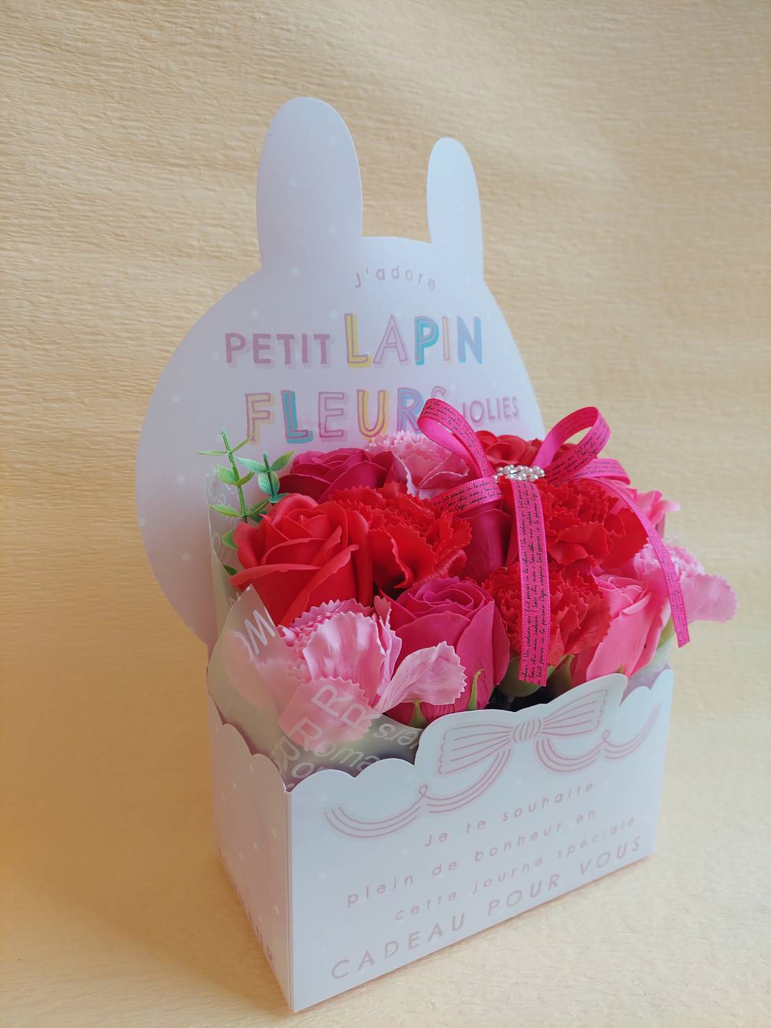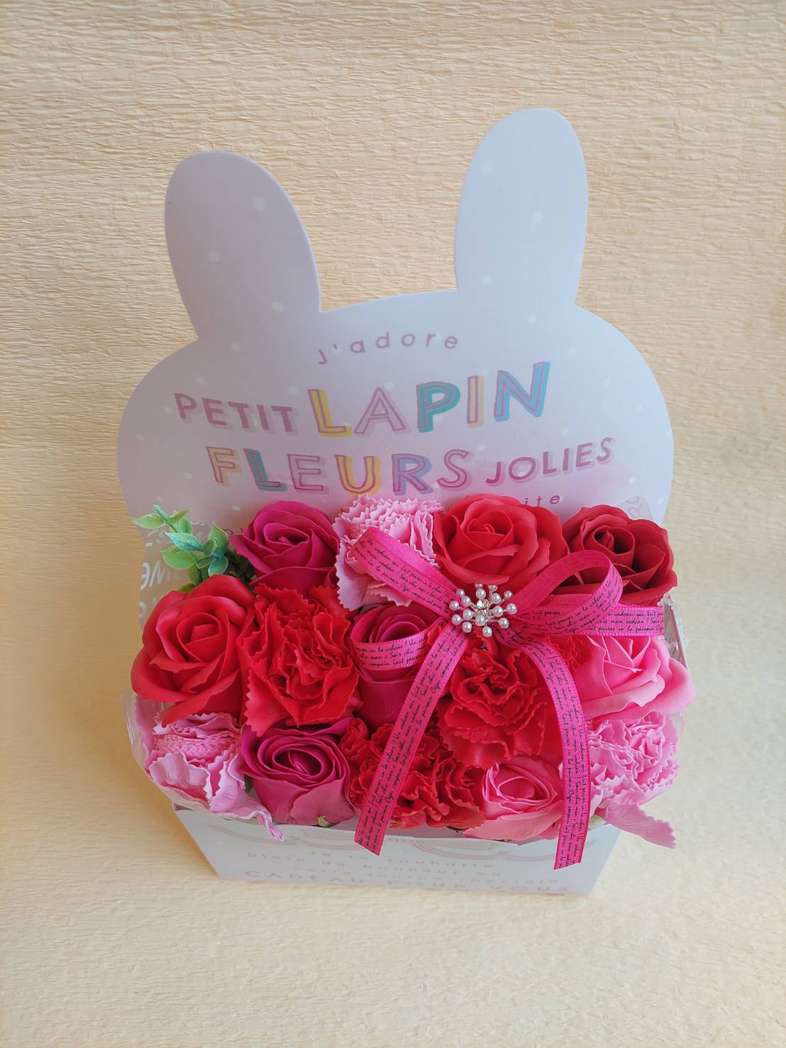 ウサギ型BOXに入った可愛らしいソープフラワーアレンジメントです。クリアバック付き。