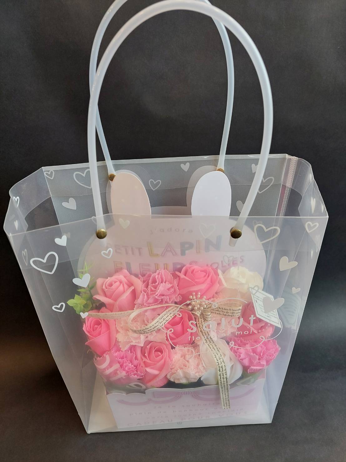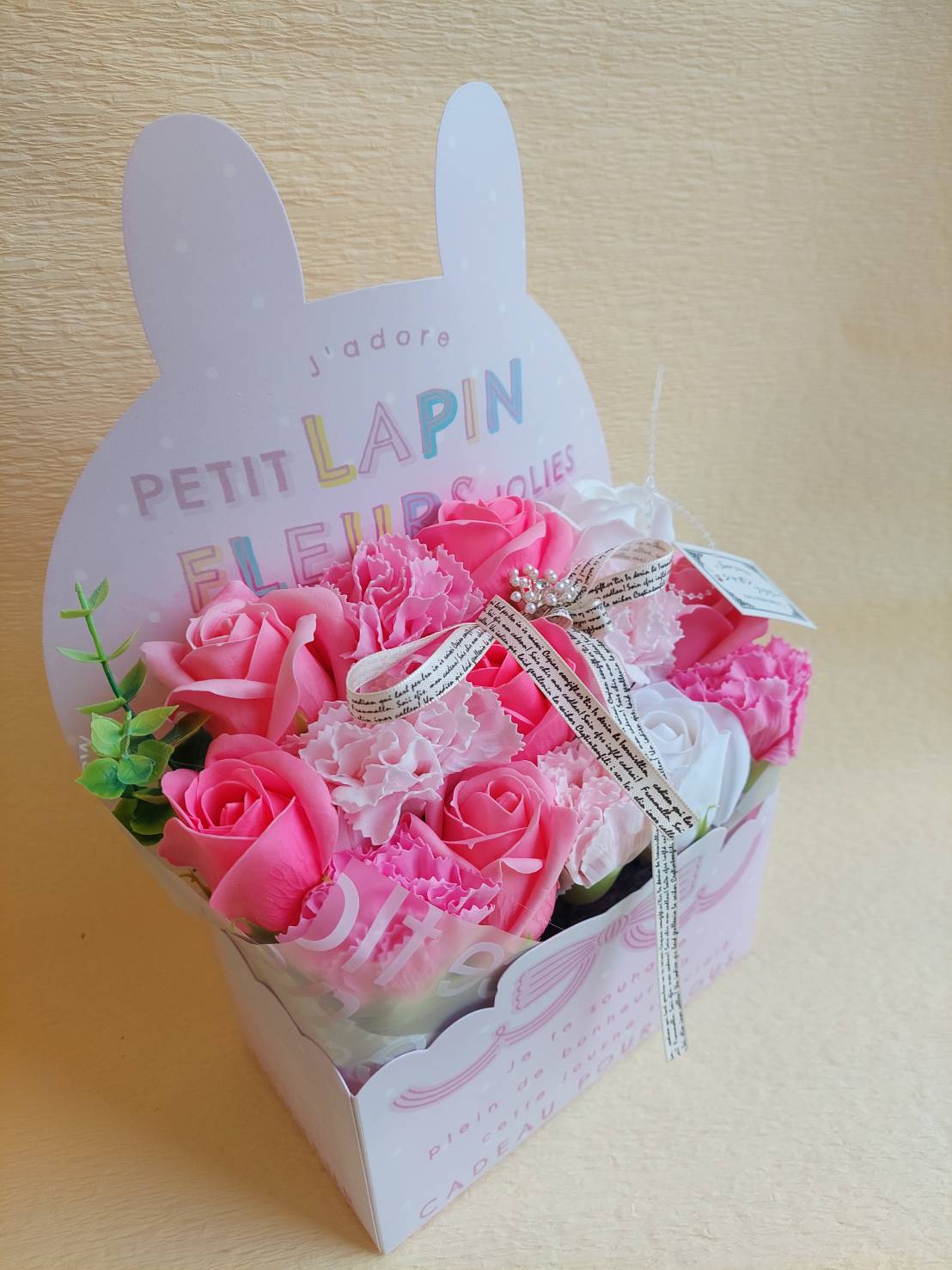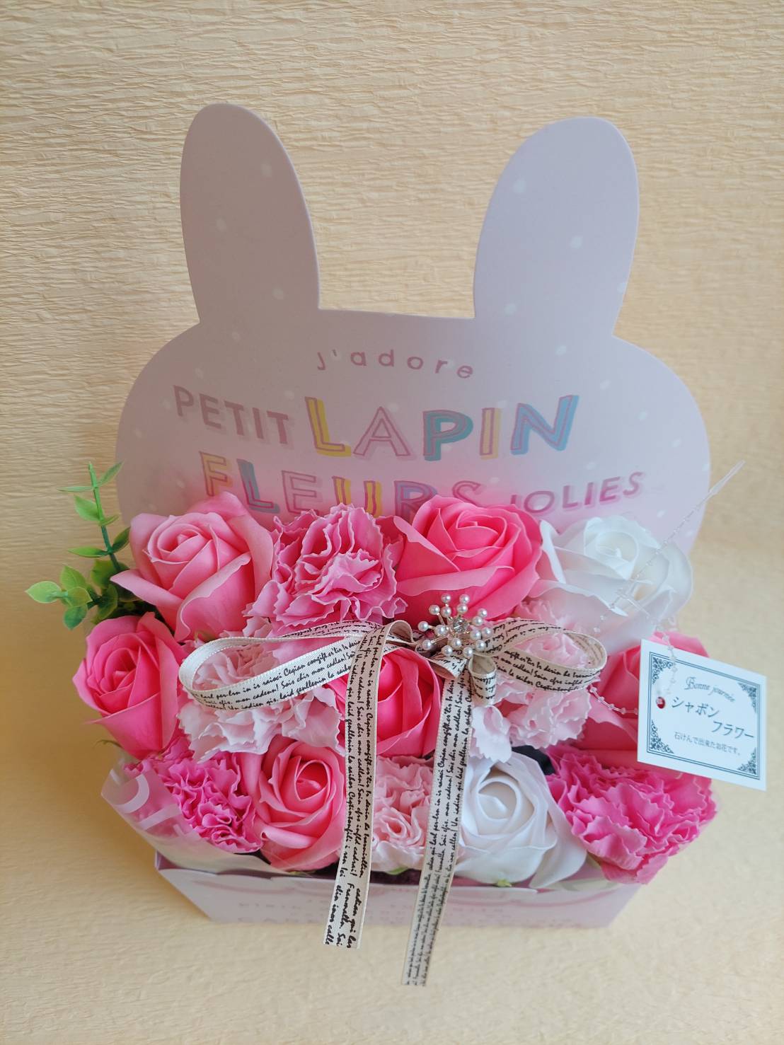ウサギ型BOXに入った可愛らしいソープフラワーアレンジメントです。クリアバック付き。