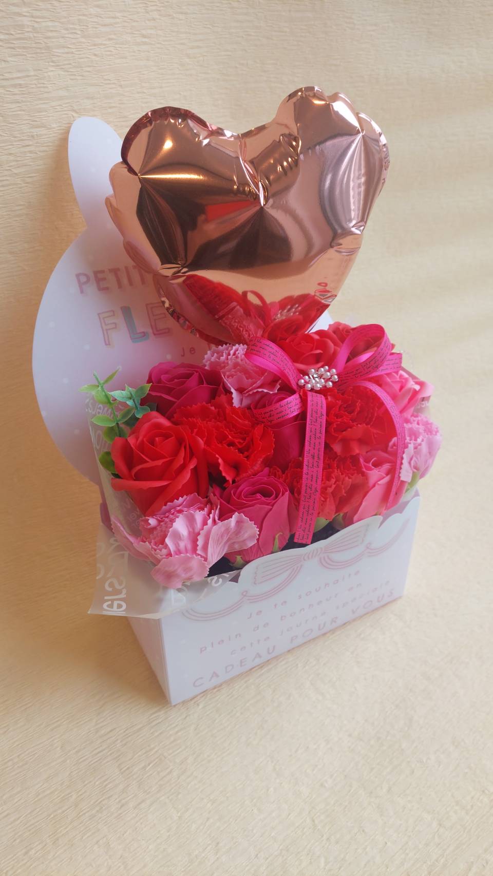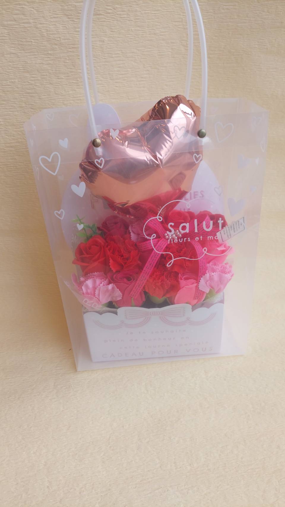 母の日プレゼントにピッタリなカーネーションとバラのソープフラワーアレンジメントです。さらに可愛いハートのバルーン入りです。手付きのバックもついています。
