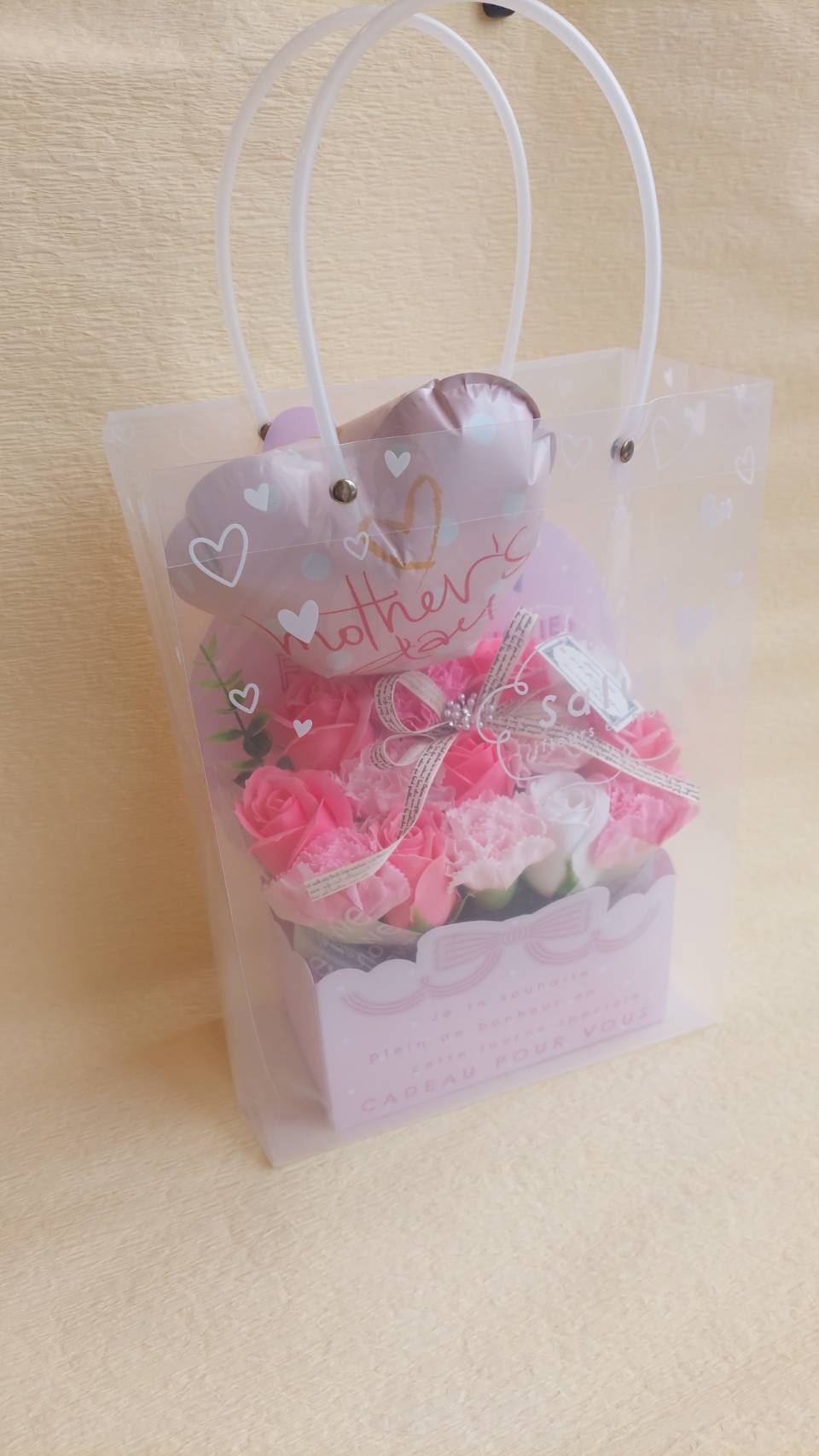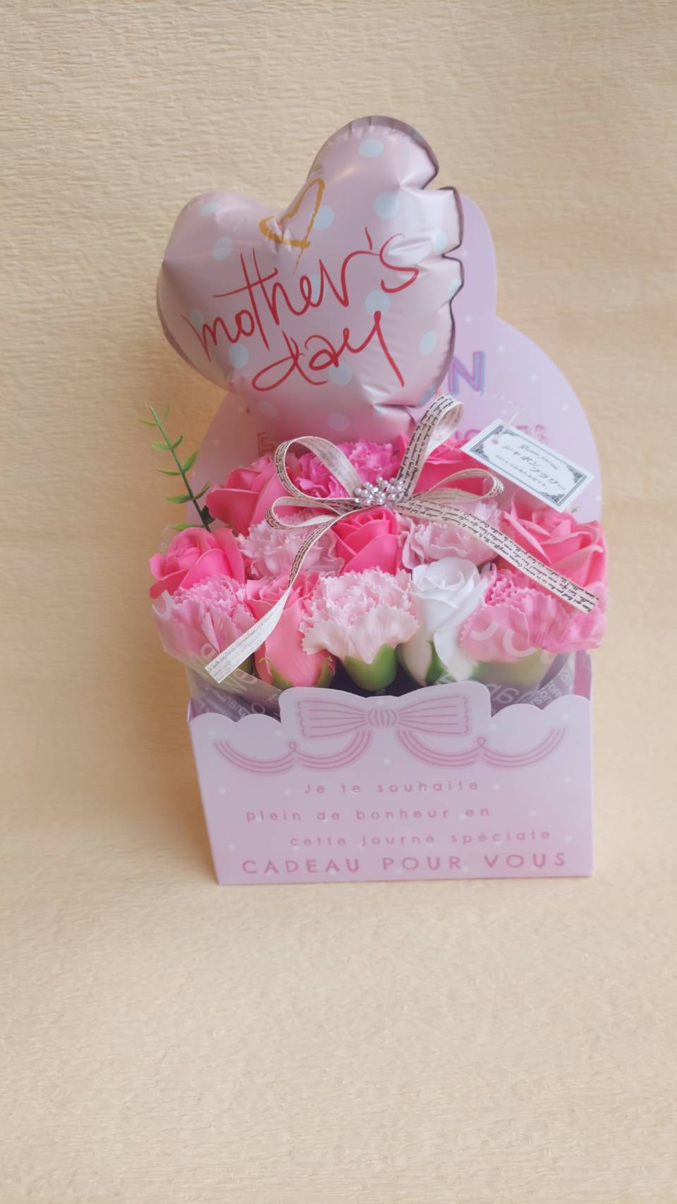 母の日プレゼントにピッタリなカーネーションとバラのソープフラワーアレンジメントです。さらに可愛い母の日のハートのバルーン入りです。手付きのバックもついています。