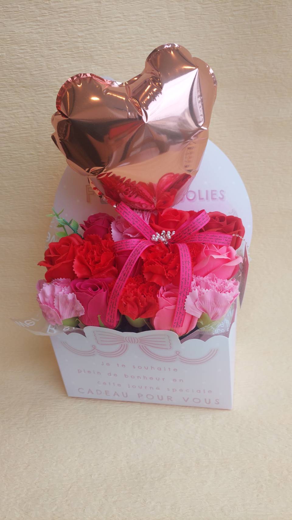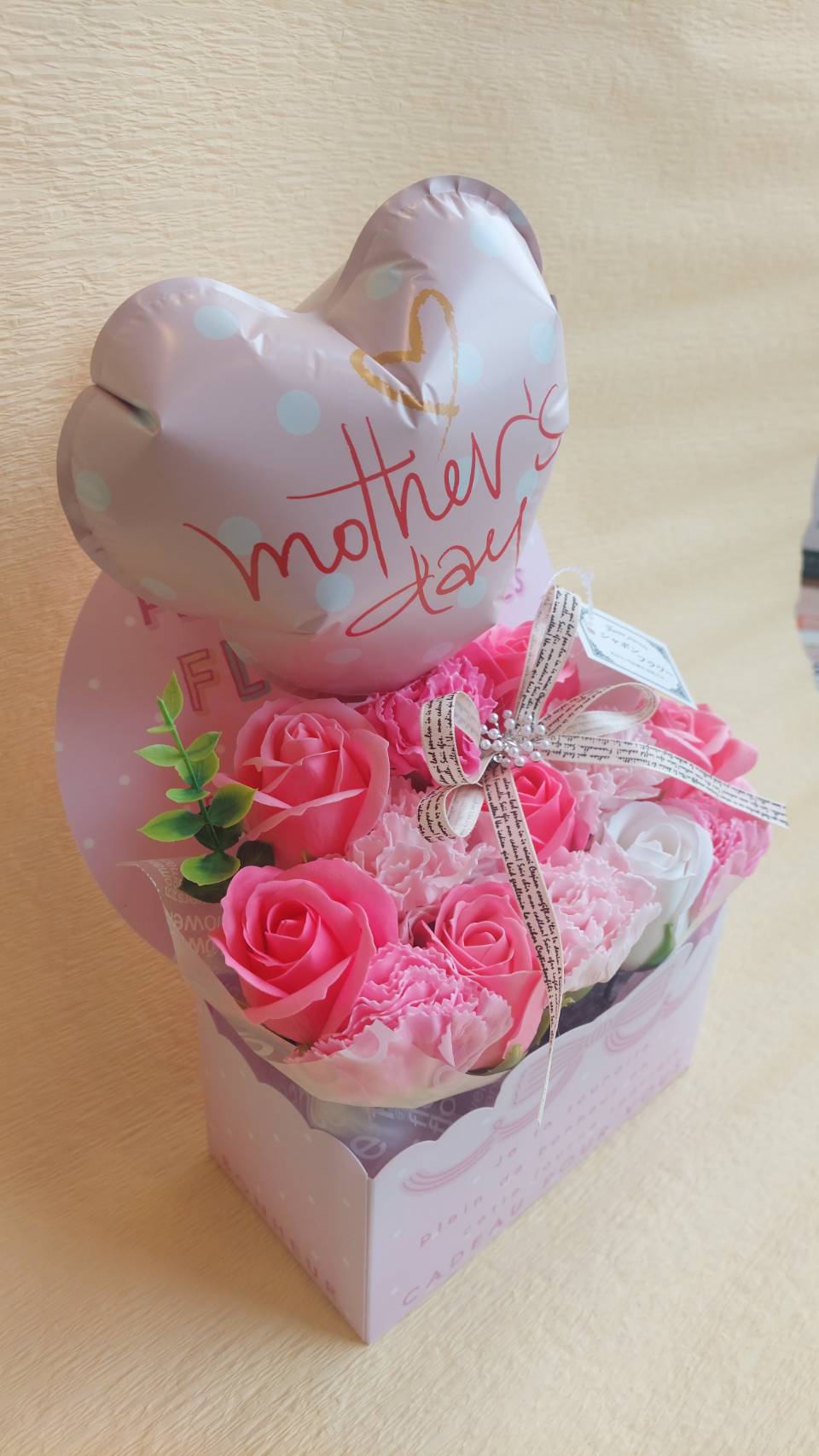 母の日プレゼントにピッタリなカーネーションとバラのソープフラワーアレンジメントです。さらに可愛いハートのバルーン入りです。手付きのバックもついています。