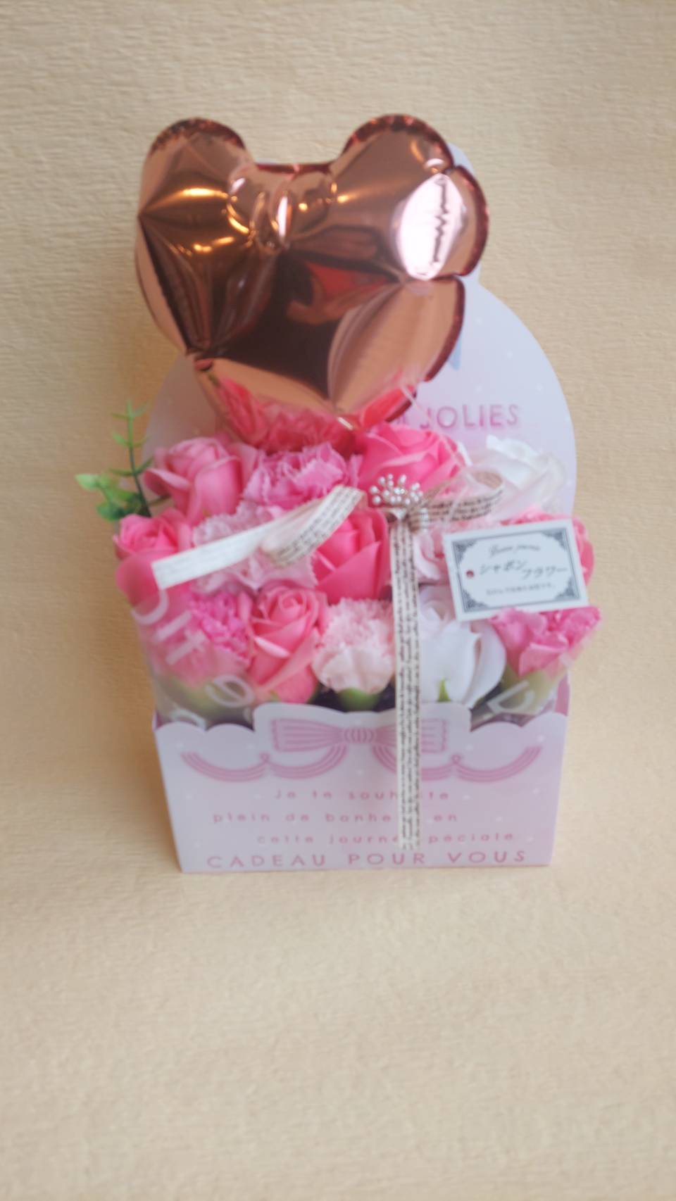 カーネーションとバラのソープフラワーアレンジメント ピンク(バルーン付き)