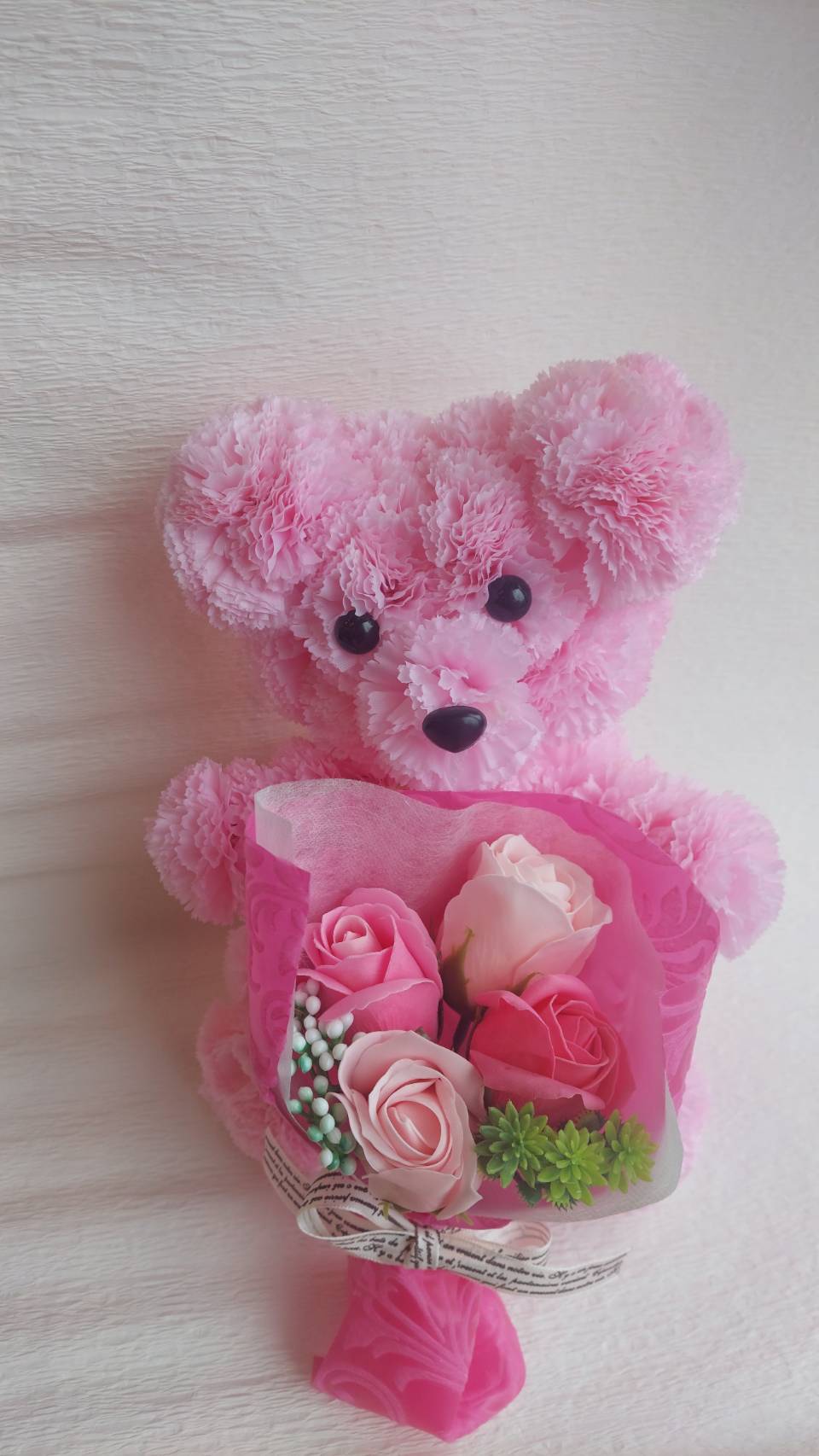 カーネーションのアートフラワーで作られたベアとソープフラワーのブーケのセットです。可愛らしいベアがブーケを抱えているようにラッピングしています。
