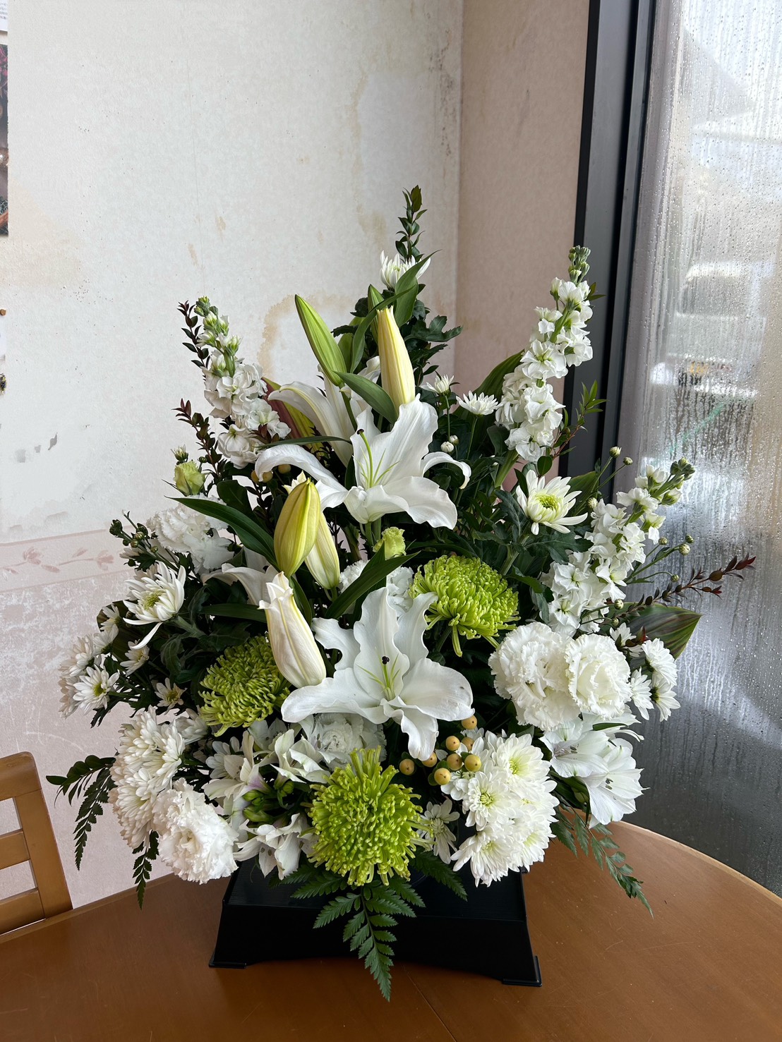 御供用のアレンジメントです。黒の台付きの器でユリ、菊、カーネーションと他の季節のお花でご用意いたします。