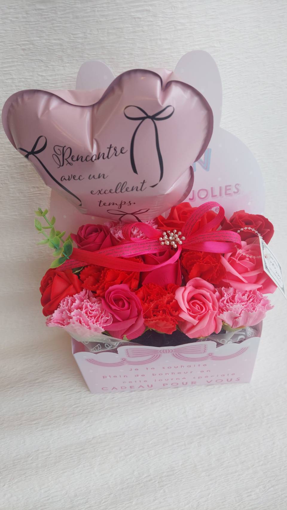 カーネーションとバラのソープフラワーアレンジメント レッド(ハートバルーン付き)