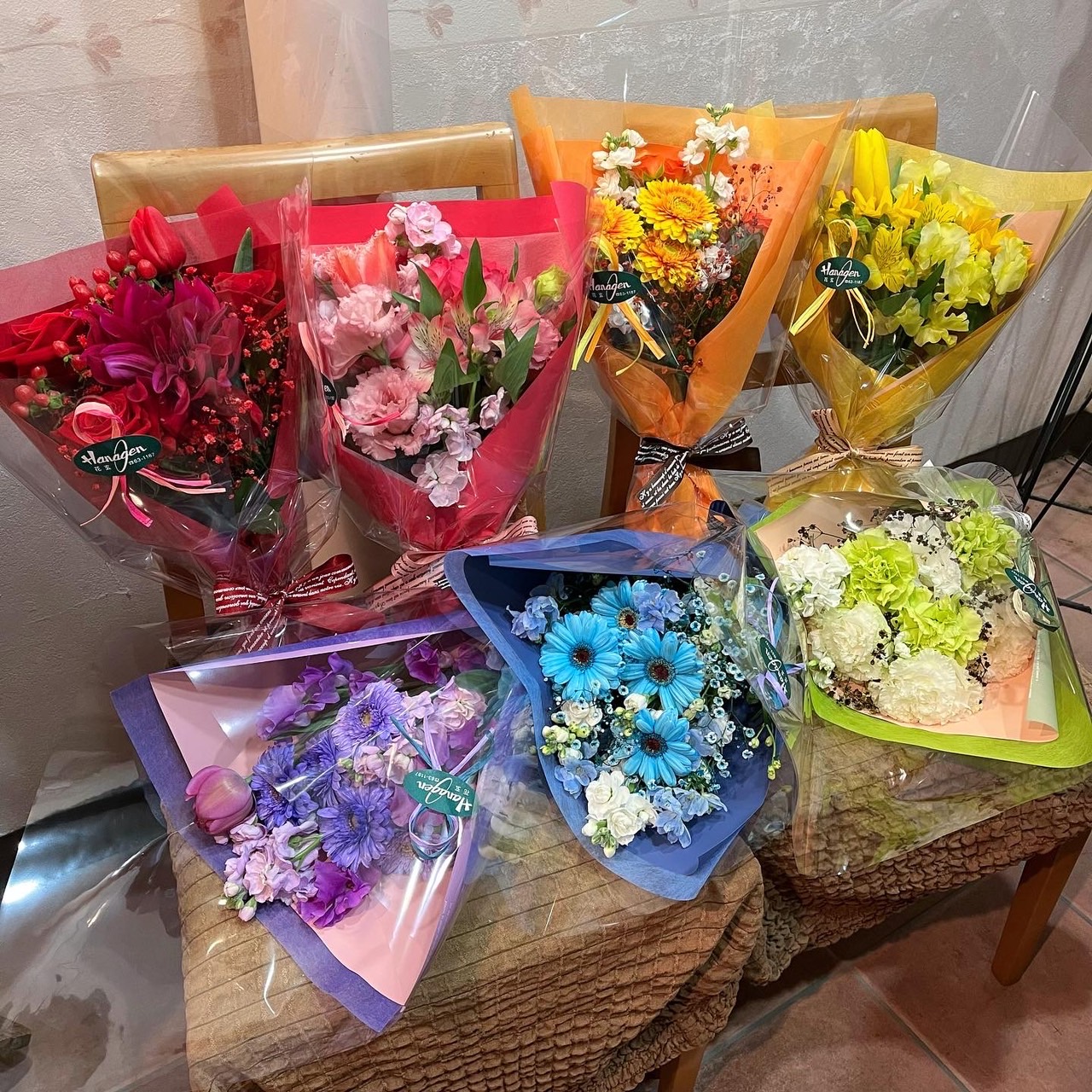 ブーケ(花束)は基本的に画像の通りにラッピングしアレンジ(カゴ花)は当店ロゴがあしらわれた不織布で包んでのお届けとなります。