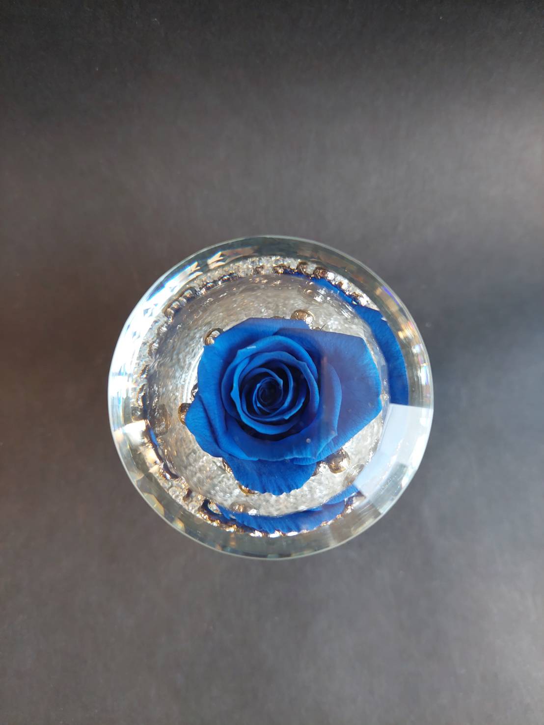 キラキラとハートの飾りの中に大輪のバラのプリザーブドフラワーが1輪。どっしりとした重厚感と高級感があります。