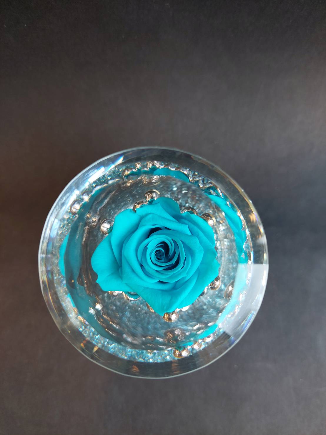 キラキラとハートの飾りの中に大輪のバラのプリザーブドフラワーが1輪。どっしりとした重厚感と高級感があります。
