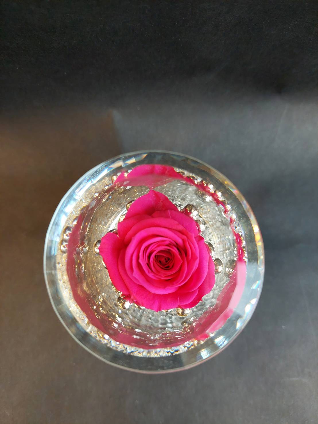 キラキラとハートの飾りの中に大輪のバラのプリザーブドフラワーが1輪。どっしりとした重厚感と高級感があります。
