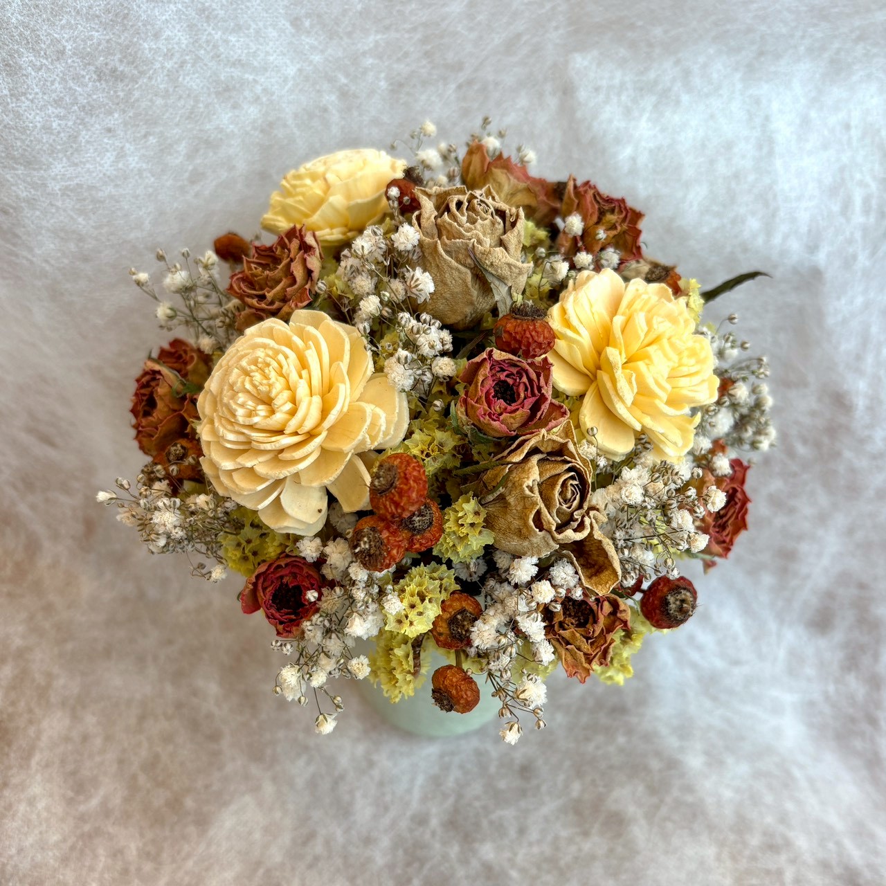 ドライフラワーは大変壊れやすいので、梱包には最善の注意を払っておりますが、配送中にわずかながら花びらが散ってしまう可能性がございます。ご了承くださいませ。