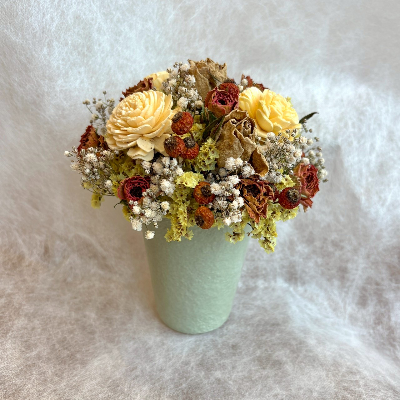 イエローベースのドライフラワーのアレンジメントです。ドライフラワーらしいシックな色合いです。ドライフラワーなのでお水やお手入れの必要も無く、届いてそのまま飾っていただけます。