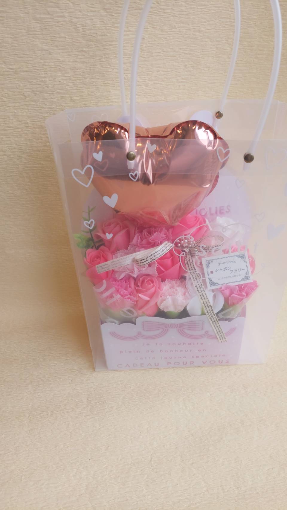 母の日プレゼントにピッタリなカーネーションとバラのソープフラワーアレンジメントです。さらに可愛いハートのバルーン入りです。手付きのバックもついています。