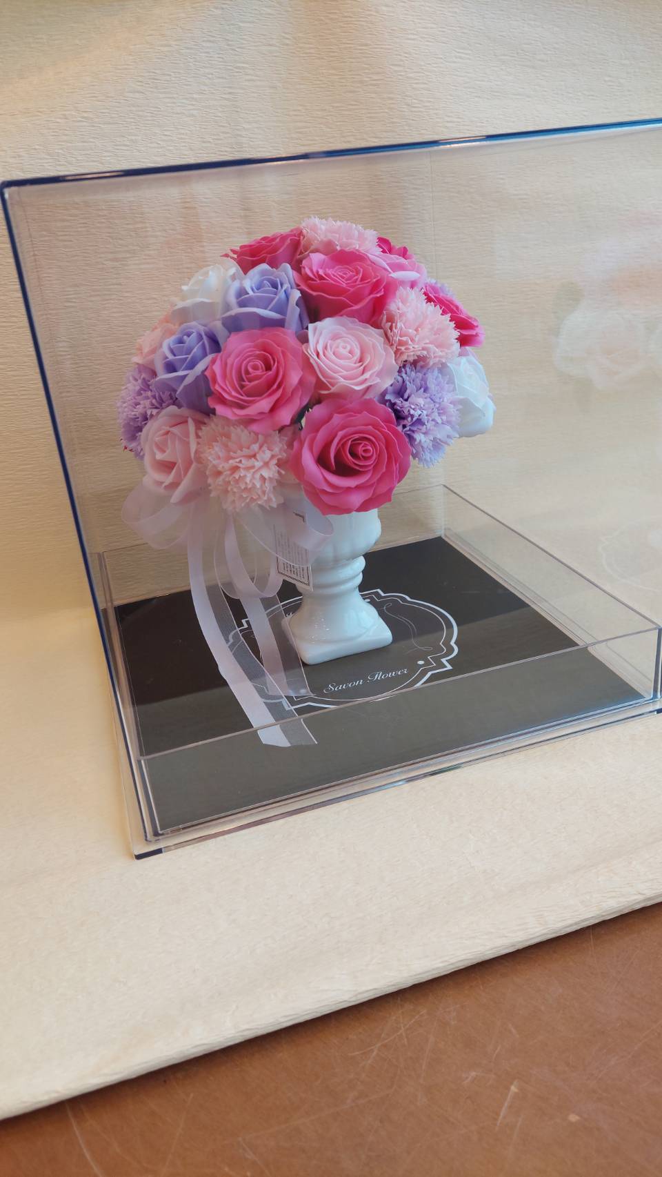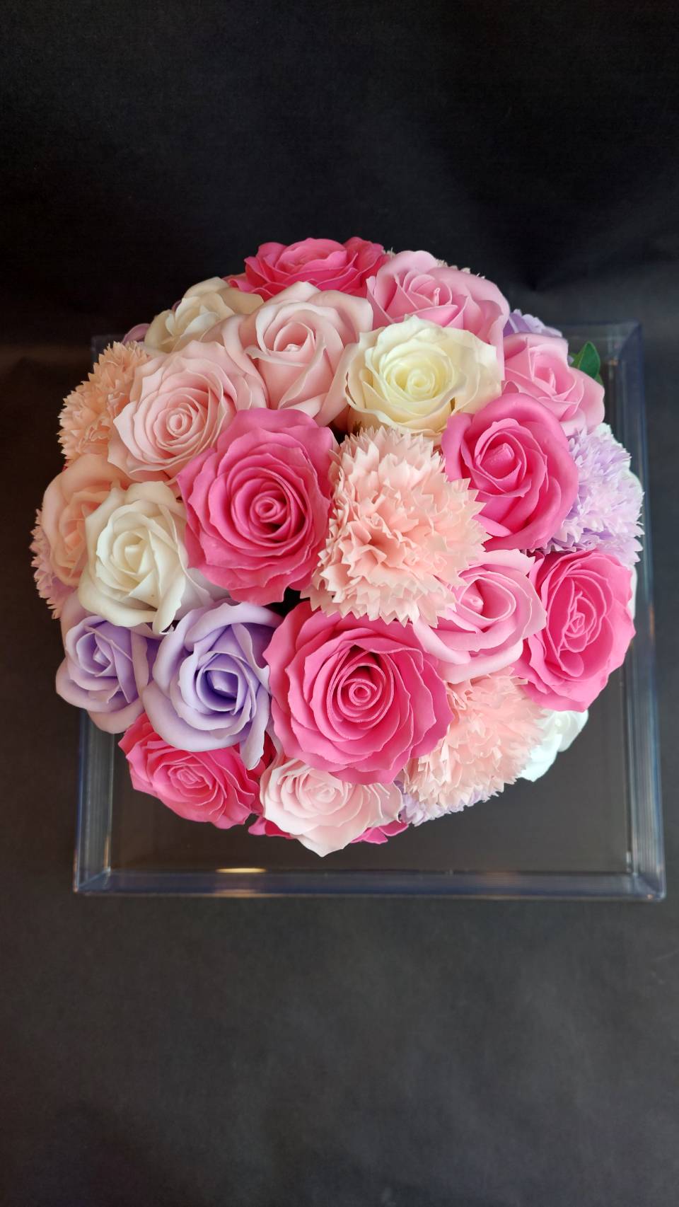 バラとカーネーションで作られたプリザーブドフラワーです。しっかりとしたケースに入っています。比較的に大きなタイプになります。
